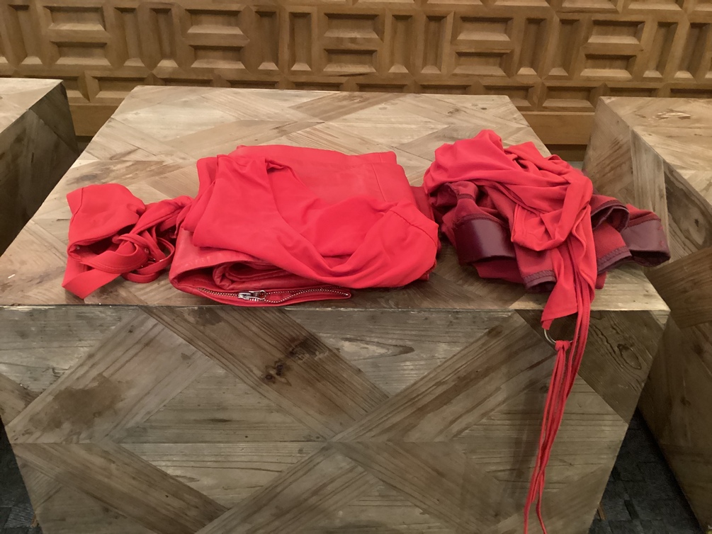 Include signed pants, panties, torn pants, a bra, etc. Various clothing, various shades of red.